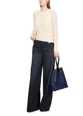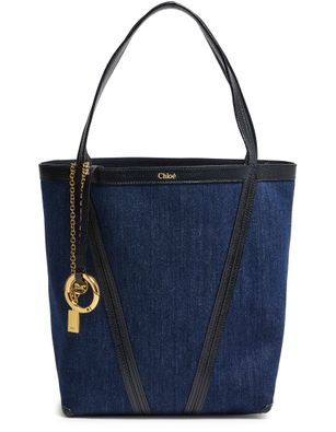 Reveal Chloe's wide leg jeans, crafted in faded denim with a high-waisted fit for ultimate comfort. Featuring a buttoned zipper closure and ankle length, these jeans offer a modern silhouette. Belt loops and back leather logo add a touch of sophistication, while visible stitching enhances the chic look.