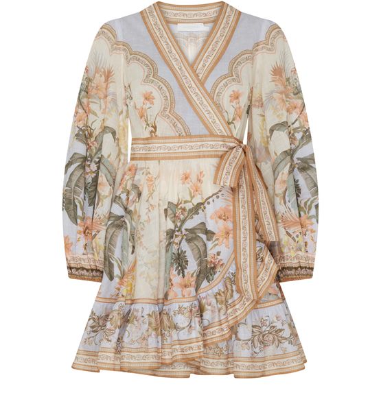 Zimmermann's Wylie mini dress showcases a chic wraparound design with a flattering v-neck and long-sleeved silhouette. Its all-over print adds a playful touch, while visible stitching enhances its artisanal charm. The appliquéd logo and a-line cut create an effortlessly stylish look, perfect for any occasion.