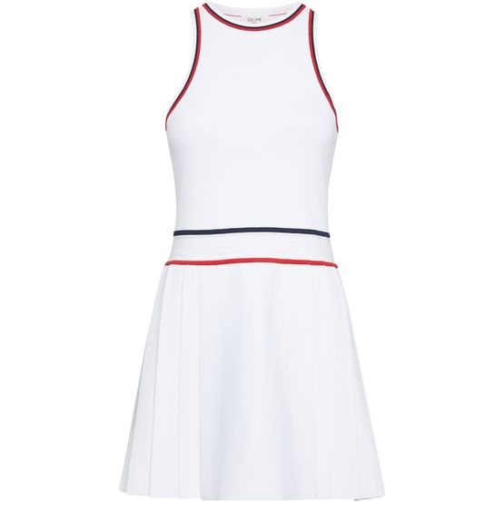 Description : Classic fit, mini length, crew neck, navy blue and red piping on the collar, sleeves and waist, celine embossed effect embroidery, pleated skirt, reference : 2ae92899t.01rl.