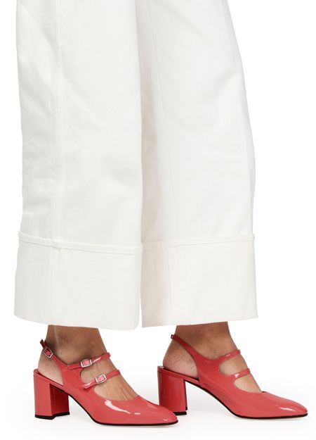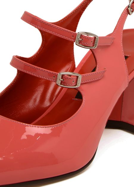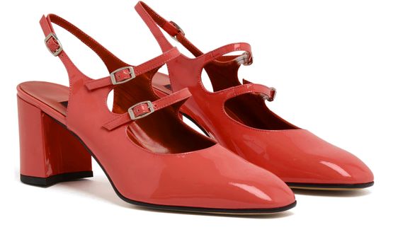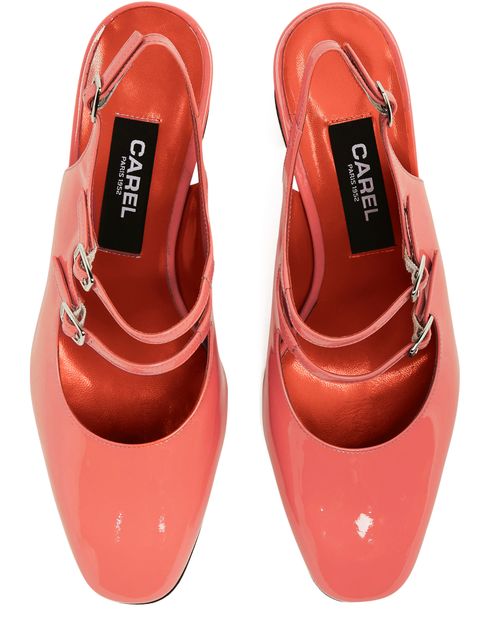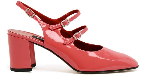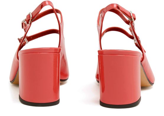 Carel's Banana pumps showcase a chic design with a buckled strap and visible stitching, offering a stylish touch. The high block heel elevates your look, while the round toe and closed silhouette provide comfort. With a secure rear strap, these pumps are perfect for any occasion, blending elegance and practicality.