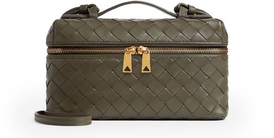 Bottega Veneta's Bang Bang vanity case combines elegance and functionality with its zipper closure and single compartment design. Crafted with visible topstitching and a gold finish, it features double handles and a detachable strap for versatile carrying options. Ideal as a toiletries bag or cosmetics pouch, it effortlessly elevates any ensemble.
