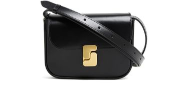 Reveal Soeur's Bell shoulder bag - a blend of elegance and functionality. This mini bag features a magnetic flap closure, single compartment, and an adjustable crossbody strap. The gold finish and metallic logo add a sophisticated touch, while visible topstitching enhances its modern appeal.