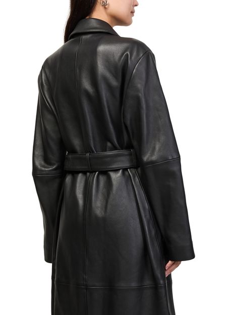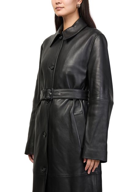 Reveal Toteme's belted leather coat, crafted from smooth leather for a refined silhouette. The long, tailored design features a classic collar, button fastening, and long sleeves, offering both elegance and versatility. Perfect for elevating any look, this piece transitions seamlessly from day to evening.