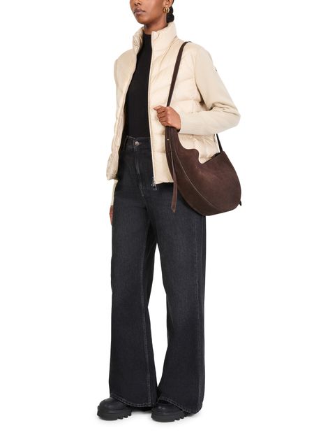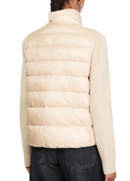 Introducing Moncler's bi-material jacket, a sophisticated addition to your wardrobe. Crafted with a sleek zipper closure, this short, high-neck puffer features welt and two front pockets for functionality. Its long sleeves complete the refined look, making it a must-have for modern style enthusiasts.