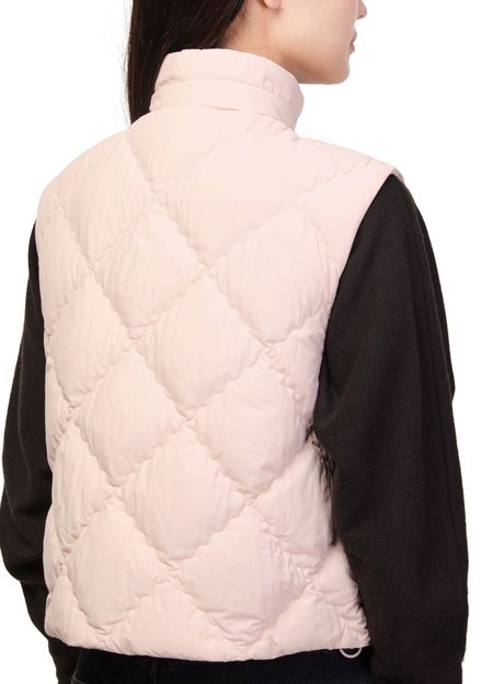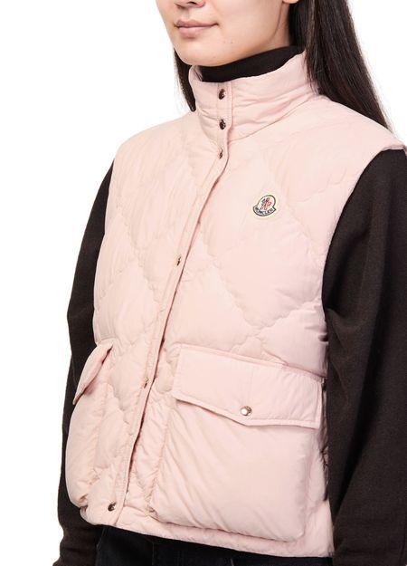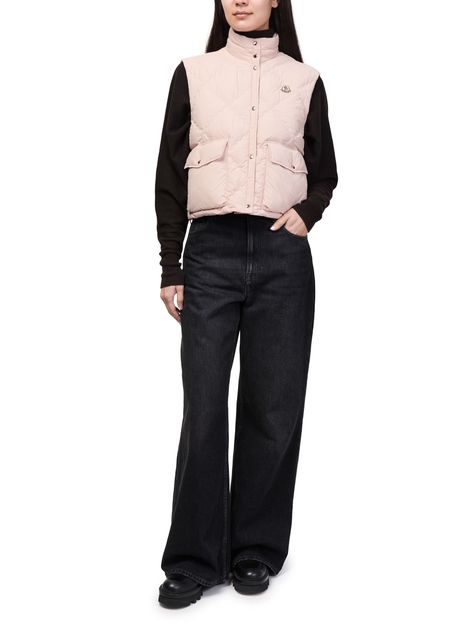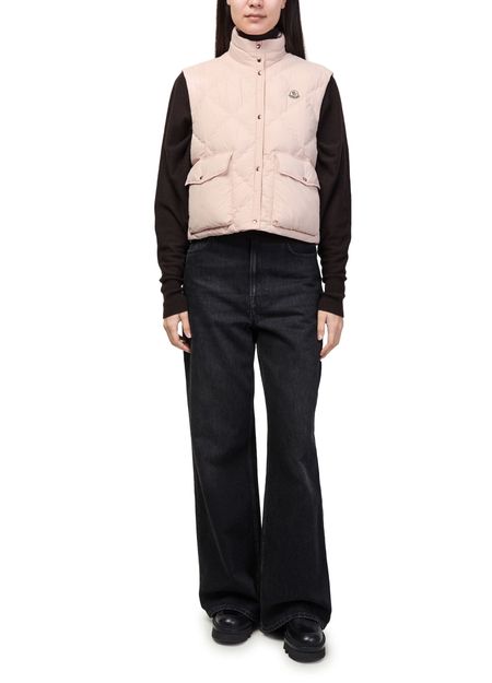 Reveal Moncler's sleeveless puffer jacket with a high neck silhouette and button fastening. The short cut and padded texture offer a modern edge, while flap pockets and an embroidered chest logo add refined detail. Perfect for layering, this piece transitions seamlessly from city strolls to weekend escapes.