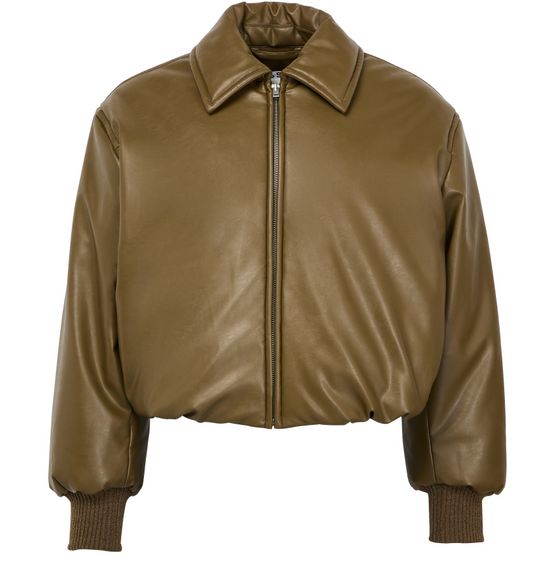 This long-sleeved bomber jacket features an appliquéd logo on the chest and a larger logo at the back, adding a bold statement to the design. The jacket is secured with a zipper closure and finished with sleek silver details for a modern touch. Perfect for adding a stylish edge to any look.
