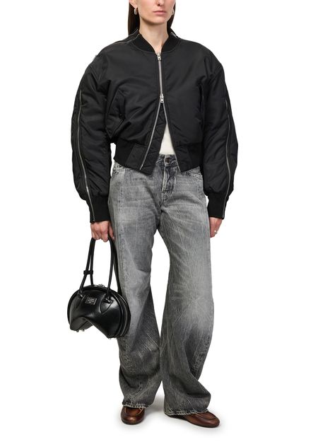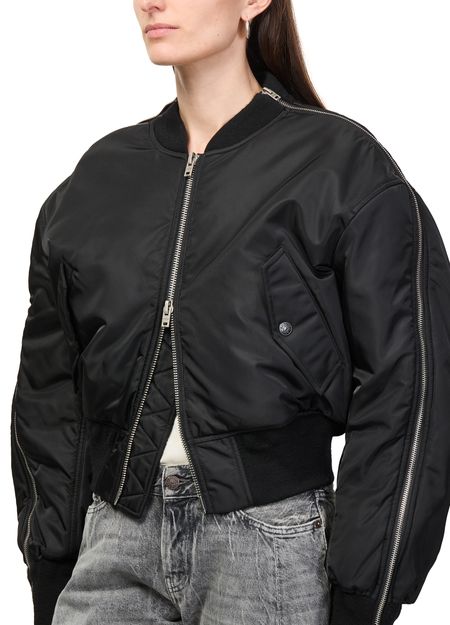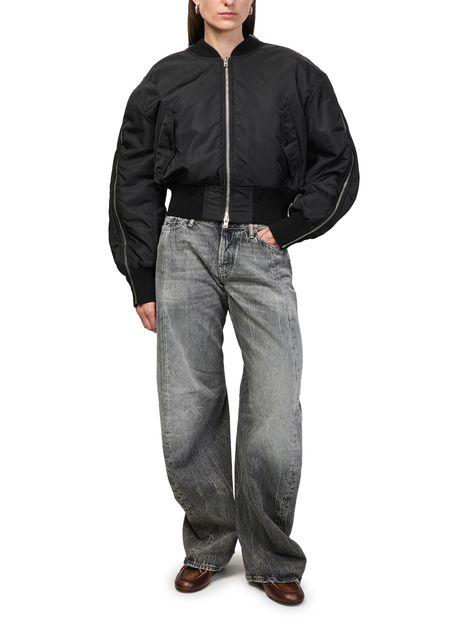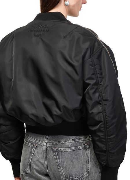 Reveal Acne Studios's bomber jacket, a short silhouette with a high neck and long sleeves. The zipper closure and two front pockets add practical flair, while the silver finish elevates its modern appeal. Perfect for versatile styling, this piece transitions seamlessly from day to night.
