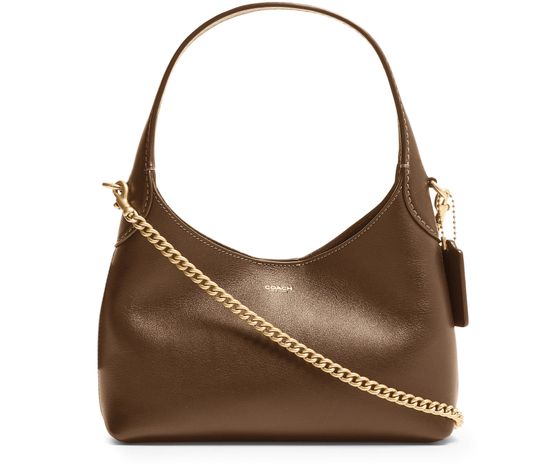 Introducing Coach's Brooklyn 23 hobo bag, crafted from smooth leather with a single handle and a detachable chain strap for versatile wear. The interior pocket and magnetic closure enhance its functionality, while the visible topstitching and gold-finish front logo add a sophisticated touch.