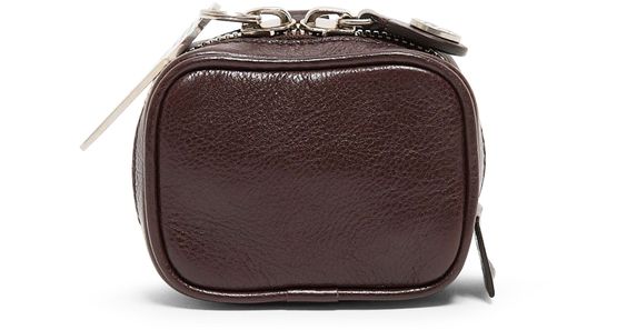 Reveal Acne Studios's Camero earphone case, crafted from grained leather with double handles for versatile carrying. The zippered front pocket and zipper closure offer secure storage, while visible topstitching and a front engraved logo add a refined, modern touch with sleek metal finishes.