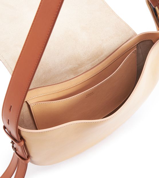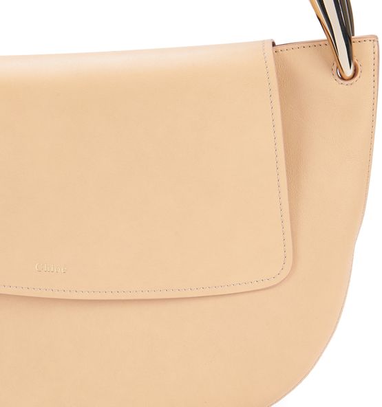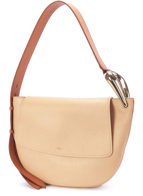 Chloé presents a creation with sophisticated details, with a slightly asymmetric effect created by the large metallic buckle on the side. In addition to its very subtle combination of textures, this piece is embellished with an adjustable, detachable shoulder strap for a choice of ways to wear: on the shoulder or crossbody. The brand's logo is delicately incorporated on the flap closure.