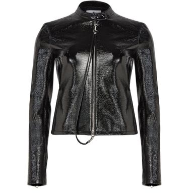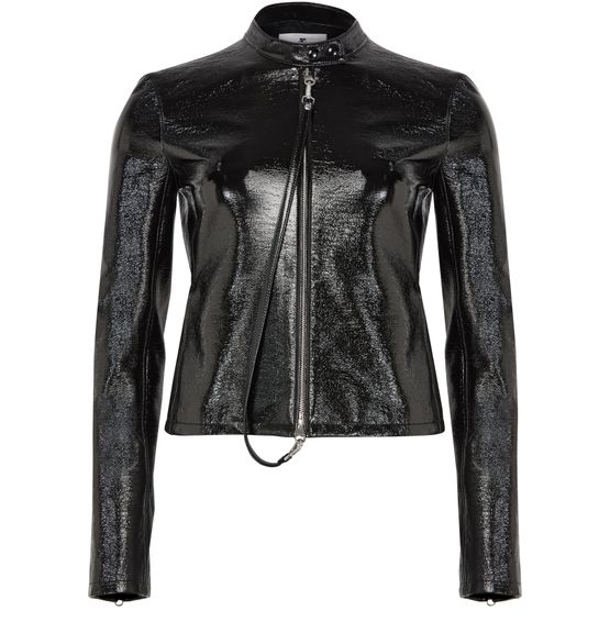 Reveal Courreges's City vinyl biker jacket, a statement in sleek patent leather with a slim fit. The short design, complete with a practical zipper closure and button fastening, exudes modern edge. Featuring long sleeves with a high neckline and a distinctive chest logo, it's perfect for any occasion.