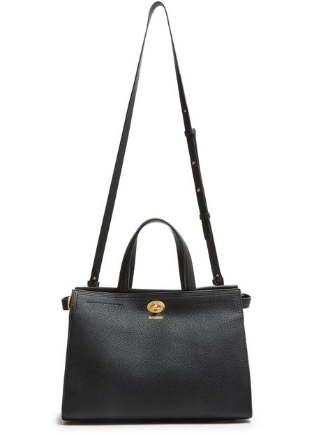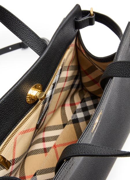 Discover Burberry's Cotswolds small tote bag, crafted in grained leather with the iconic Burberry Check design. Featuring double handles and a thin, adjustable strap for versatile wear, this bag boasts a large interior compartment and a zippered pocket. The twist lock closure and gold-finished logo add elegant sophistication.