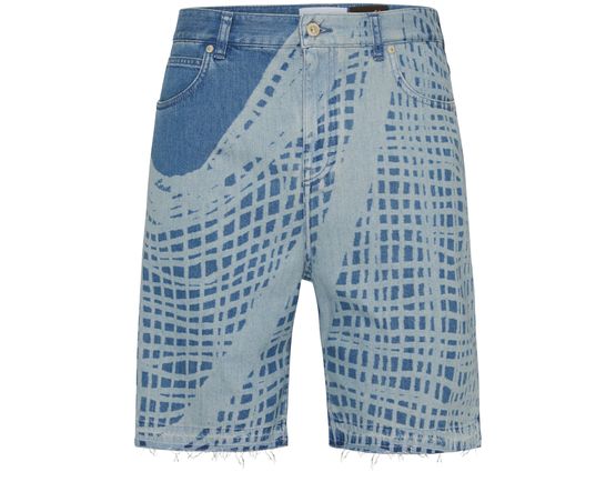 Loewe's Cotton denim shorts with print feature an appliquéd logo at the back and a patch detail. These knee-length shorts are designed with a five-pocket style, belt loops, and a buttoned and concealed zipper closure for a sleek look.
