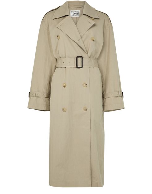 Introducing Toteme's Cris summer trench, a perfect blend of style and functionality. This long, double-breasted piece features a notched collar and flap pockets, ideal for a modern wardrobe.