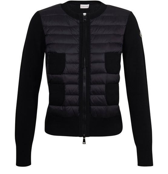 Moncler presents this two-fabric jacket with a modern design. This piece with a zippered closure combines technical fabric with a shiny effect and virgin wool panels.