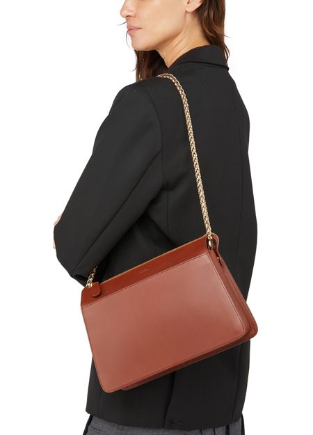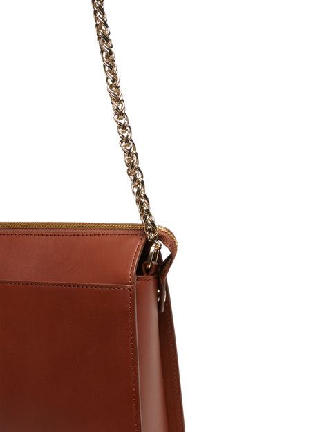 • Description : Smooth leather bag, chain strap, logo in gold letters on the front, gold finish, zipper closure, worn on the shoulder.
