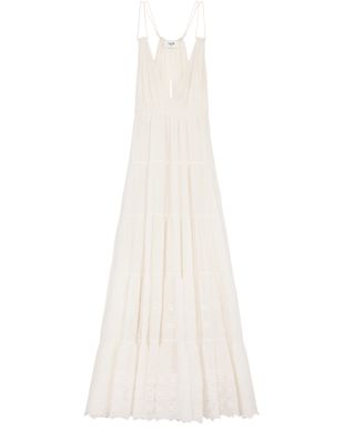 Introducing Celine's embroidered long dress in cotton silk crepon. This Triomphe Broderie Anglaise piece features a classic fit with maxi length and two side pockets. The design is complete with a V-neck, back opening, and a central back zip with a hook-and-eye closure, offering effortless elegance.