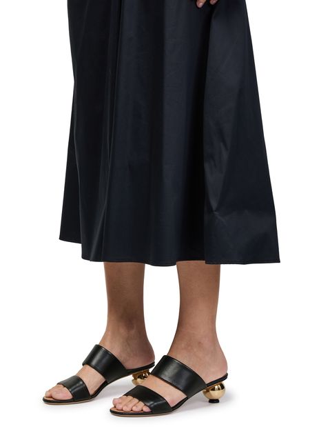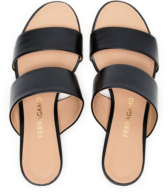Reveal Salvatore Ferragamo's Spherical heel slide, crafted with a refined round open toe and medium heel for a modern silhouette. Gold finish accents and visible stitching add a polished touch, while the open design ensures comfort and effortless sophistication for any occasion.