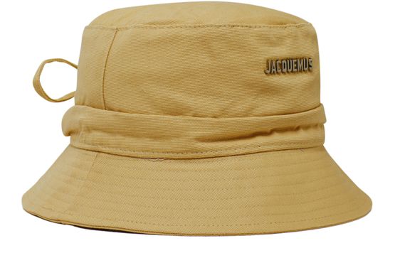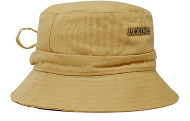The Jacquemus Gadjo bucket hat features a round crown and short visor, with visible stitching and silver finishes. Embellished with a strap and tie fastening, it also boasts a metallic logo on the front. With a head circumference of 58 cm, it's a stylish and practical accessory for any outfit.