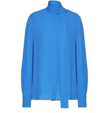 Valentino's Georgette blouse showcases a sophisticated neck scarf that adds elegance to any outfit. Its invisible button front closure creates a seamless look, while the unlined design offers breathability. A subtle logo label on the back completes this refined piece, perfect for both casual and formal occasions.