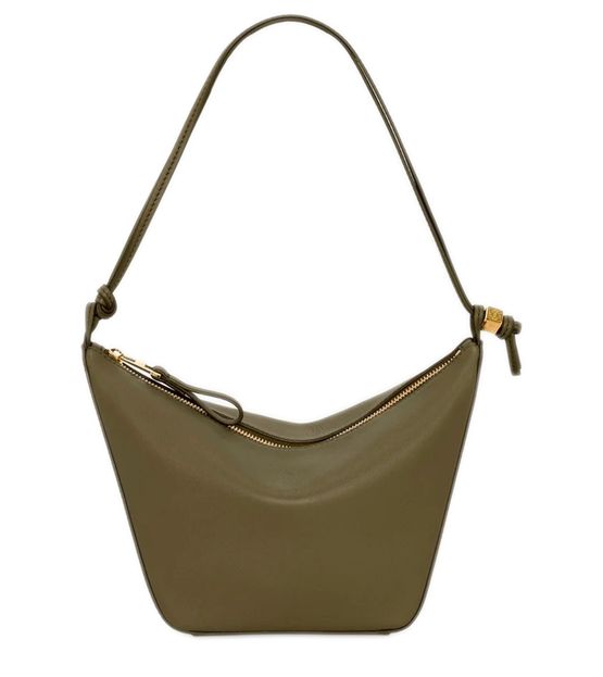 Discover Loewe's Hammock Mini Hobo Bag, a masterpiece in smooth leather with a sophisticated silver finish. This bag offers a single compartment with a zipper closure and an adjustable thin strap for versatile wear. Embossed with Loewe's iconic logo and adorned with visible topstitching, it reflects timeless elegance.