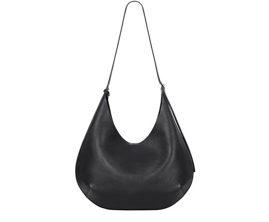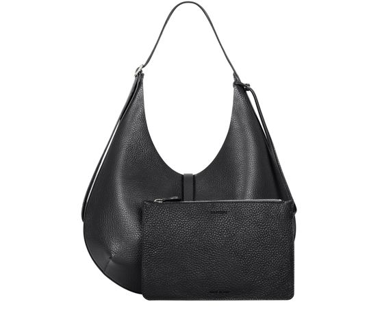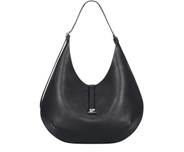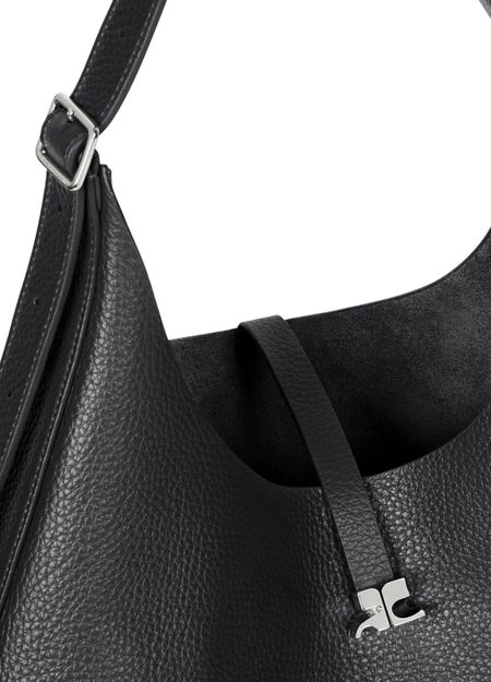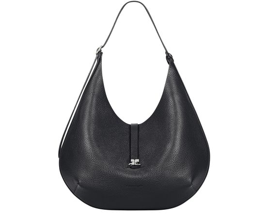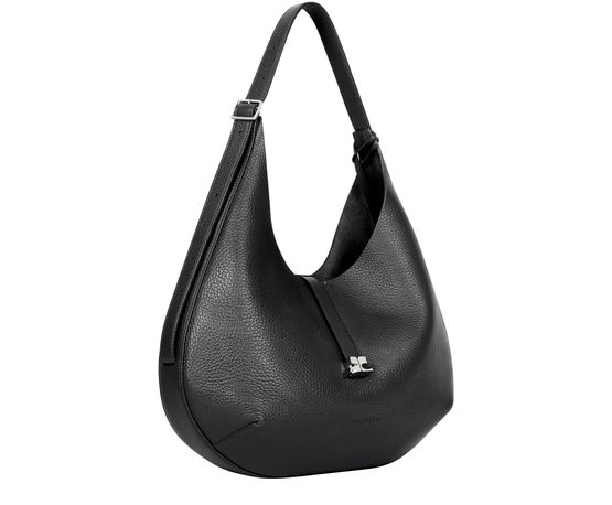 Reveal Courreges's holy hobo bag, crafted from grained leather with a single handle for effortless sophistication. The metallic logo on the front and silver clasp add a modern edge, while the detachable interior purse and zippered pocket ensure practical elegance for everyday style.
