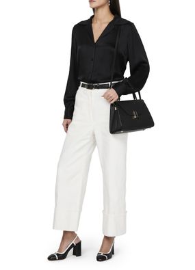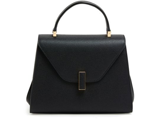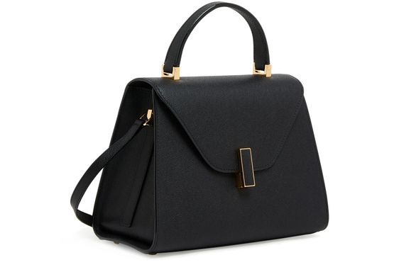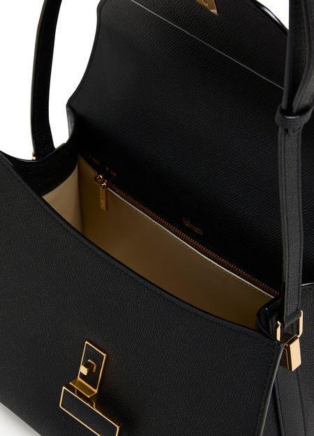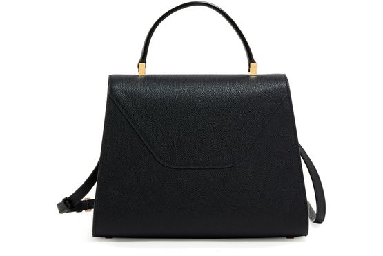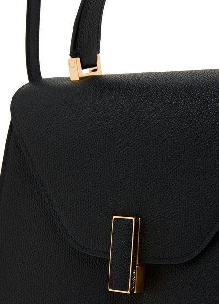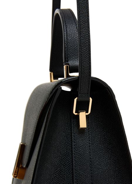 Reveal Valextra's Iside handbag, a masterpiece of grained leather craftsmanship. This shoulder bag features a single handle and a thin, adjustable, detachable strap for versatile wear. The twist lock closure secures a single compartment lined with contrast fabric, highlighted by visible topstitching and a gold finish.