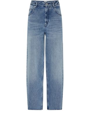 Isabel Marant's Joanny jeans showcase a high-waisted fit with a straight cut, offering a chic silhouette. Featuring a buttoned and concealed zipper closure, belt loops, and a five-pocket style, these denim jeans are finished with visible stitching and an appliquéd logo. The back leather logo adds a touch of elegance, perfect for any occasion.