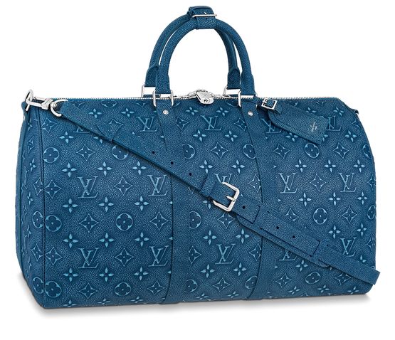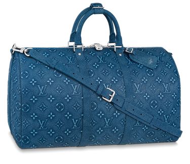 The House’s classic weekend bag, the Keepall Bandoulière 50, is fashioned from leather with a faded Monogram feel, achieved through a two-step process of debossing and printing. Trimmed with denim-blue leather – on the two lateral bands, top handles and nametag – this Keepall exudes understated sophistication.