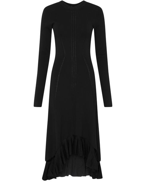 Victoria Beckham's Long Sleeve Flared Midi dress showcases a sophisticated long-sleeved silhouette with a refined crew neck. Ruffle details gracefully cascade down the skirt, adding a touch of elegance to this timeless piece. Perfect for any occasion, it effortlessly combines style and comfort, making it a must-have in your wardrobe.