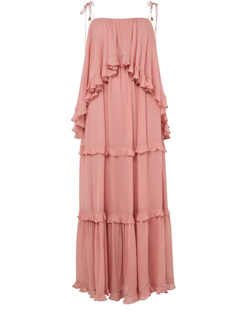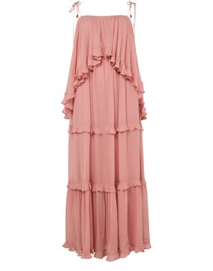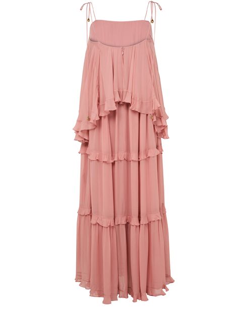 Reveal Zimmermann's Luna ruffled dress, a maxi silhouette defined by its round neck and sleeveless cut. Flared with delicate ruffle details and elegant shoulder straps, this piece offers a graceful flow, making it a standout choice for both daytime events and evening occasions.