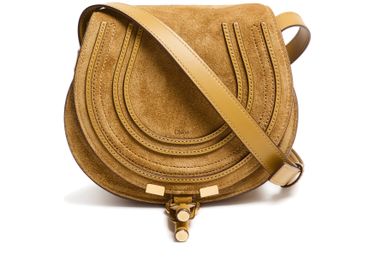 Celebrate Chloe's Marcie shoulder bag with its signature saddle stitch detailing. Crafted in sumptuous suede, it features a flap closure and adjustable thin strap for versatile wear. The interior pocket and gold finish add a touch of elegance, making it both stylish and functional.