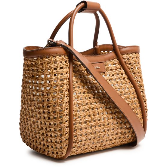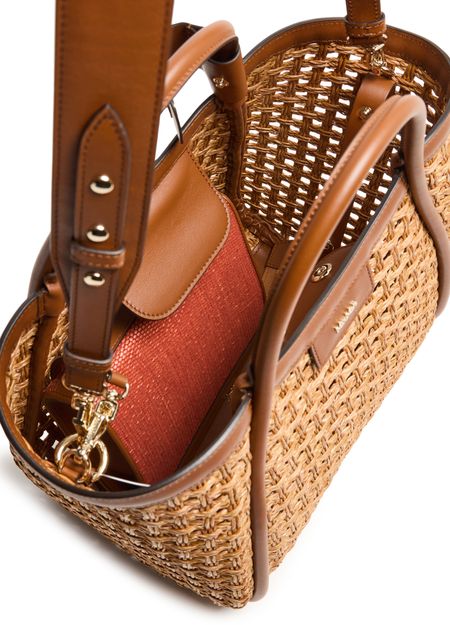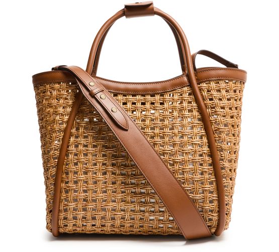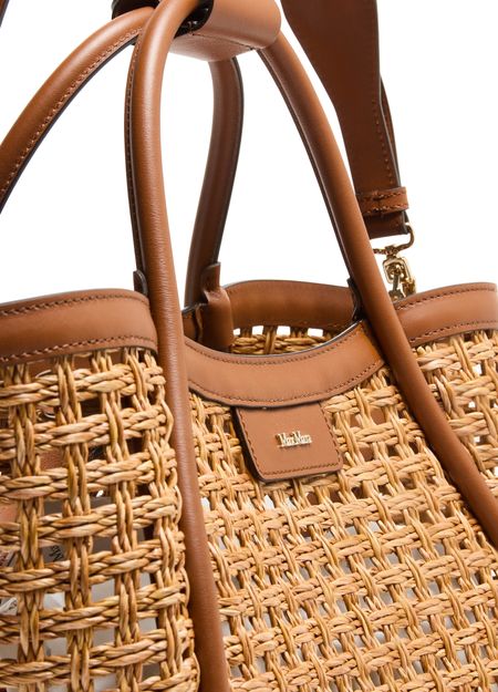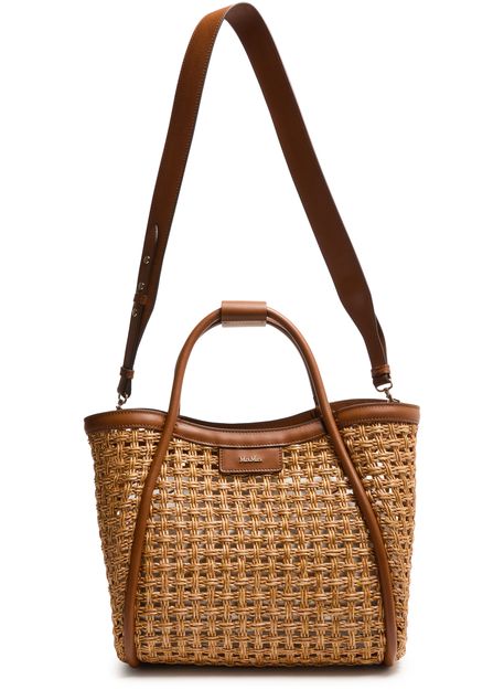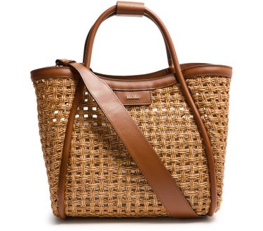 Reveal Max Mara's marine basket bag, a statement piece with double handles and a wide, adjustable strap for versatile styling. The detachable interior purse and keyring add practical flair, while the metallic logo and gold finish elevate its modern appeal. Snap-button fastening secures your essentials in style.