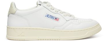 Autry's Medalist sneakers are leather lace-up shoes with a round toe and graphic cut-outs. They feature a logo on the side and tongue, with a thick outsole for durability. A fabric tab with a matching color label adds a stylish touch, while the leather and cotton sponge lining ensures comfort.