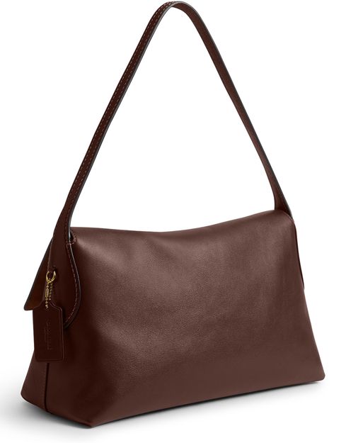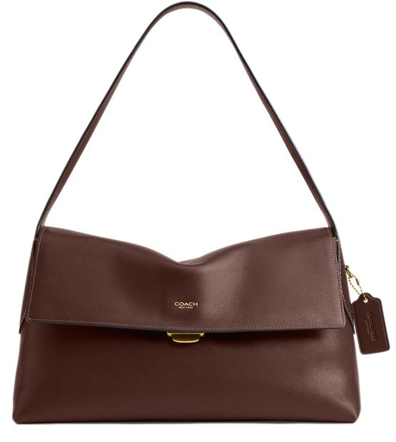 Reveal Coach's medium flap shoulder bag, crafted from smooth leather with a decorative label featuring the embossed Coach logo. Gold-finish hardware and visible stitching highlight its refined design, while a zippered interior pocket and contrast lining add both function and style.
