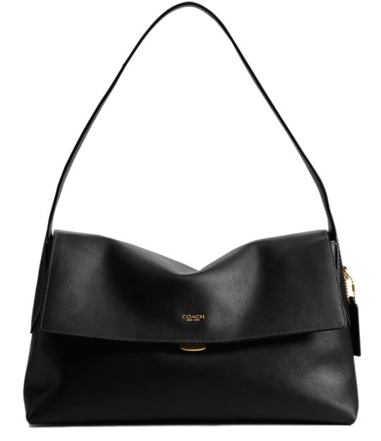 Reveal Coach's medium flap shoulder bag, crafted from smooth leather with a gold clasp and elegant gold finish. The front features an embroidered Coach logo and a decorative label, while visible topstitching and a single handle add refined structure. A zippered interior pocket ensures practical sophistication.