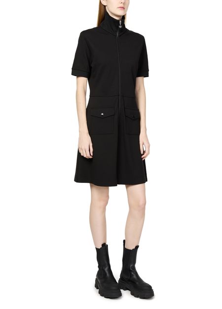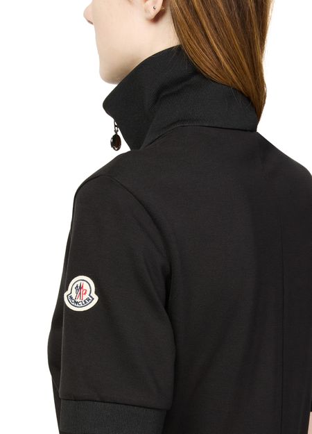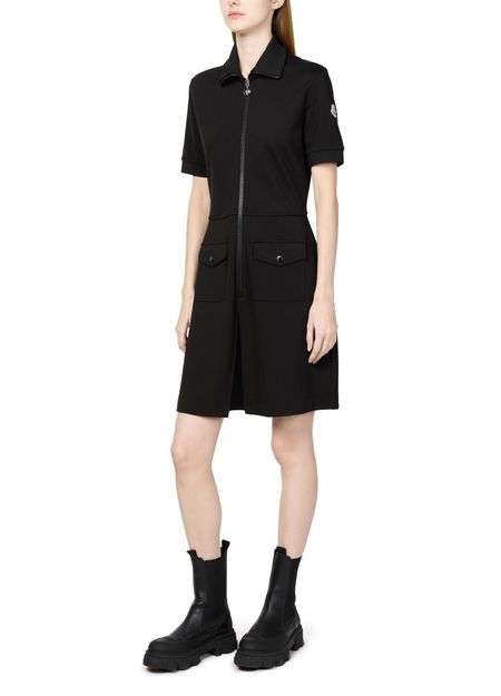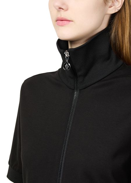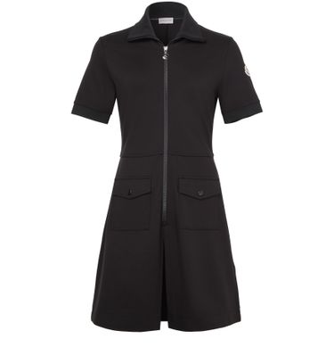 Moncler's mini dress showcases a chic short-sleeved design with a high-neck and an eye-catching appliquéd logo on the side. Its flattering a-line cut offers effortless style, while the practical zipper closure and two front flap pockets add functionality. Perfect for a casual day out or a stylish evening.