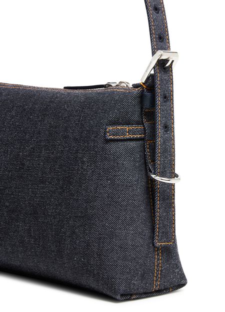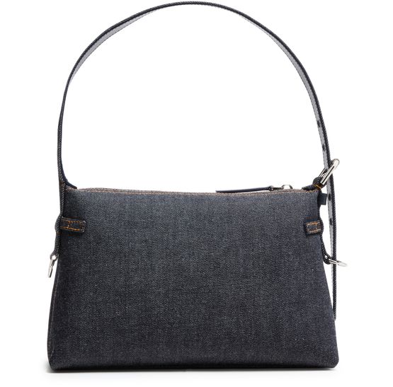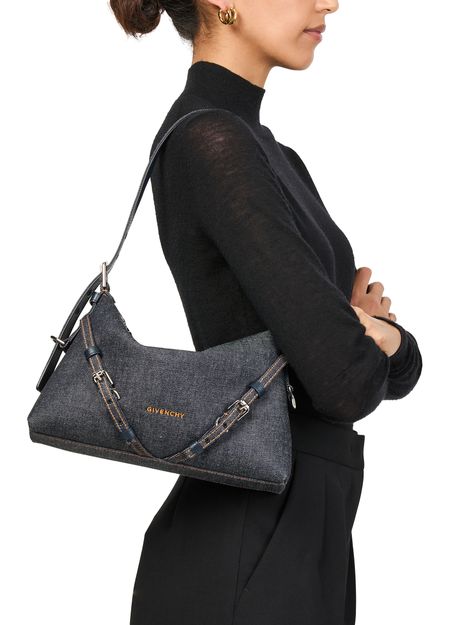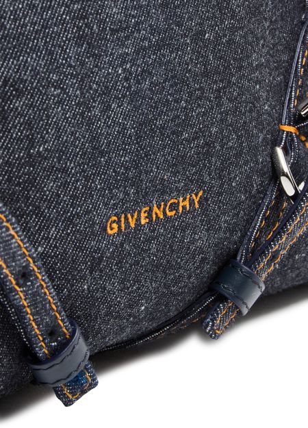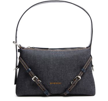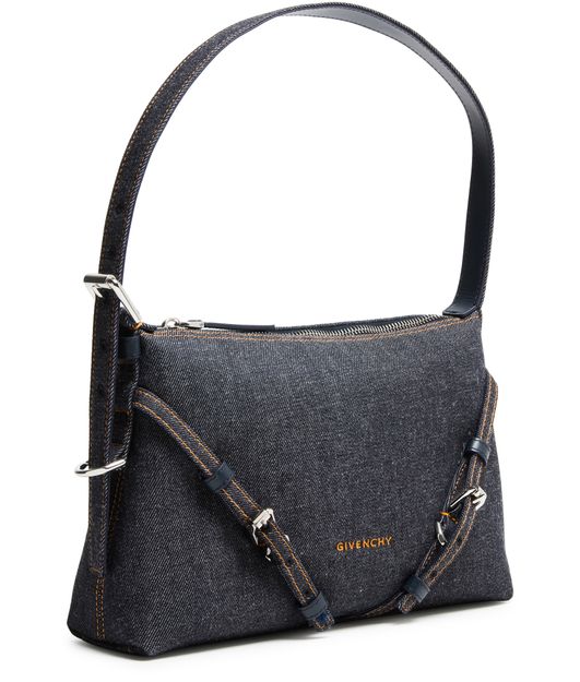 Reveal Givenchy's Voyou mini denim bag, crafted from faded denim with a single handle. This piece features visible stitching and a front logo, offering a modern touch. The zipper closure and single compartment ensure practicality, while the silver finish adds a sleek edge.