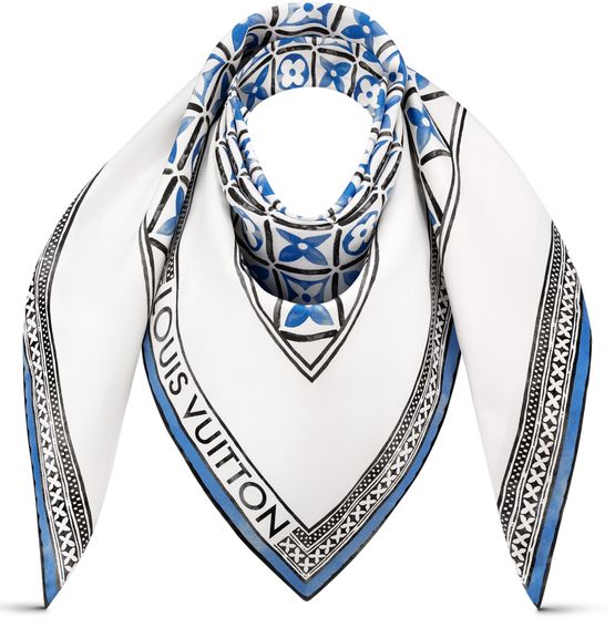 The Monogram Flower Tile square features an eye-catching pattern from the Resort capsule collection, inspired by the carefree days of summer vacation. Louis Vuitton’s famous stylized blossoms appear in a tile-like grid, contrasting with a white border and a graphic edge integrating the House signature. A creative new way to wear the Monogram look.