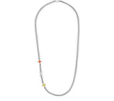 Crafted from a fine metal chain with a palladium-colored finish, the Monogram Row Necklace is discreetly ornamented with two colorful Monogram Flowers and an LV charm, and completed with a sophisticated clasp. Available in two colorways, this refined piece pairs with a matching bracelet, bringing subtle distinction to smart and casual menswear looks.