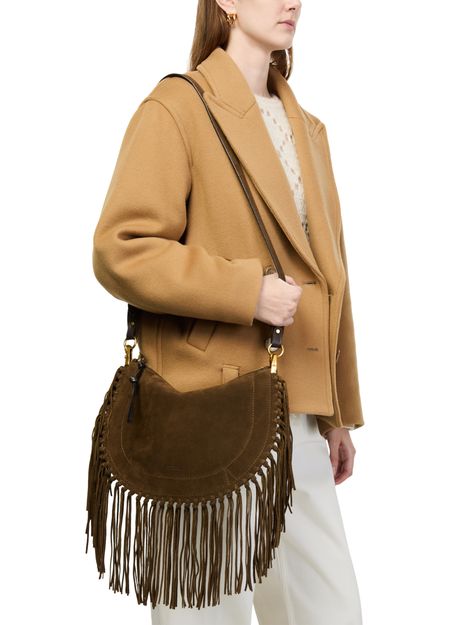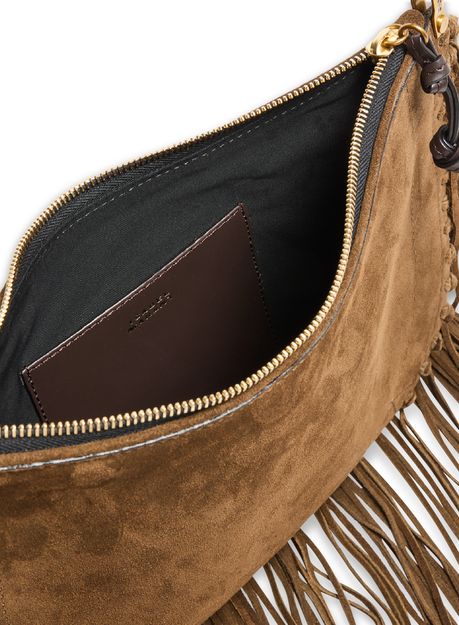 Reveal Isabel Marant's Oskan soft zipped shoulder bag, crafted from supple suede with a single handle and a thin, adjustable strap for versatile wear. Gold-finish hardware and visible stitching accentuate its refined silhouette, while fringe details and an interior pocket add both flair and function.