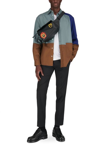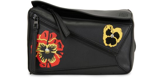 Worn across the chest or on the waist, the small Puzzle Pansies bag has a flap design featuring a zippered front pocket and Loewe logo details embossed among floral motifs.