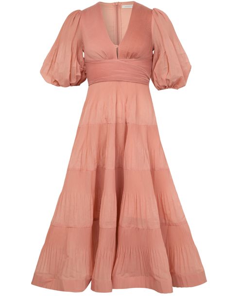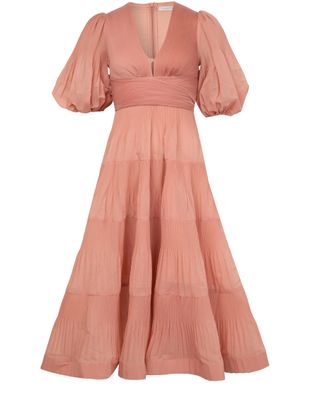 Zimmermann's Pleated midi dress showcases a flattering v-neck and short-sleeved puff design, perfect for any occasion. With a concealed back zipper closure and visible stitching, this flared dress combines elegance and comfort, making it a timeless addition to your wardrobe that effortlessly enhances your style.