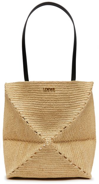 Loewe's Puzzle Fold Tote in raffia is a chic shopper/tote bag with a gold finish and front logo detail. It can be worn on the shoulder with its thin strap or carried by the double handles for a versatile look.