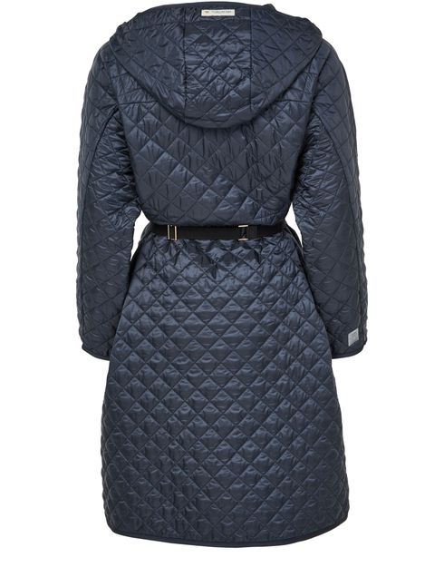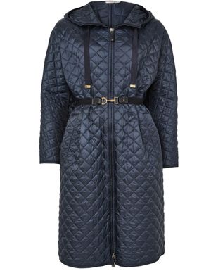 Reveal Max Mara quilted hooded coat, crafted from chevron quilted leather with a distinctive diamond pattern. The knee-length, collarless silhouette features a padded texture, long sleeves, and a sleek zipper closure. Side pockets add practicality, making this puffer a versatile choice for both casual and refined looks.