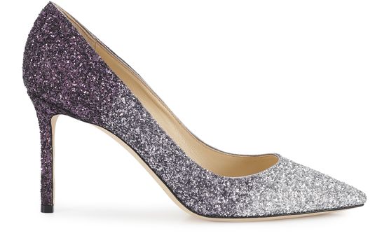 The Romy 85 pumps are covered in an impressive graduation of metallic hues formed by iridescent sequins. These refined shoes with a bold look are designed by Jimmy Choo.