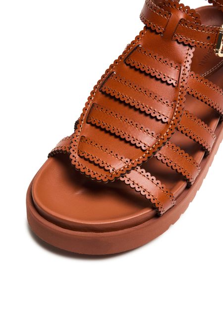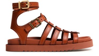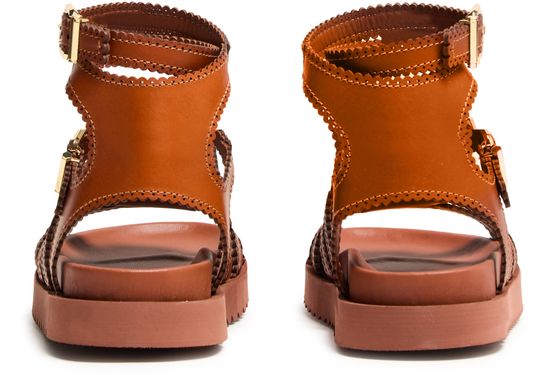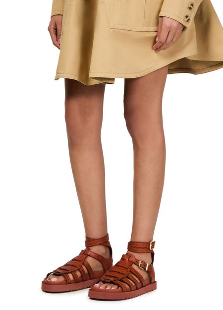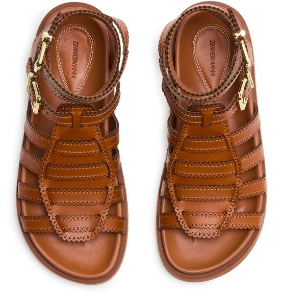 Indulge in Zimmermann Sandales Golide Gladiator, crafted for the modern enthusiast. These sandals feature a chic peep toe design, highlighted by a buckled ankle strap for secure elegance. The flat heel and gold finish exude timeless sophistication, while visible stitching accentuates refined artistry.
