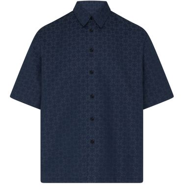 Givenchy's Shirt in shiny monogram 72 denim showcases a short-sleeved design with a front buttoned closure. Its appliquéd logo and all-over logo create a striking visual, complemented by visible stitching. This casual shirt, with a classic shirt collar, effortlessly combines style and comfort for any modern wardrobe.
