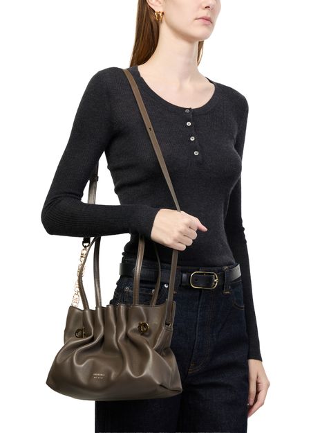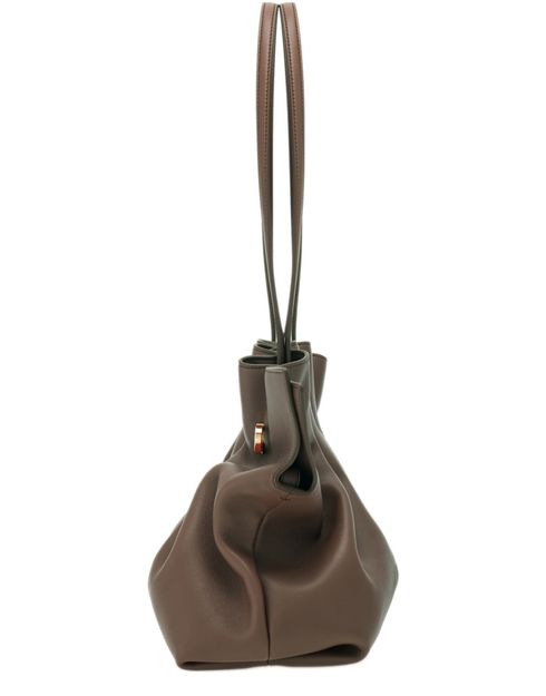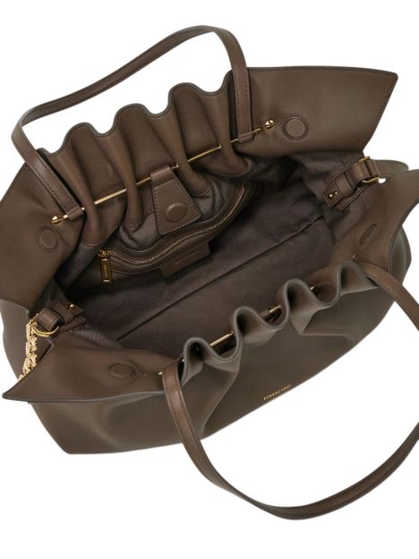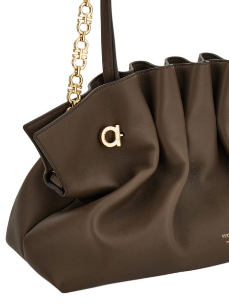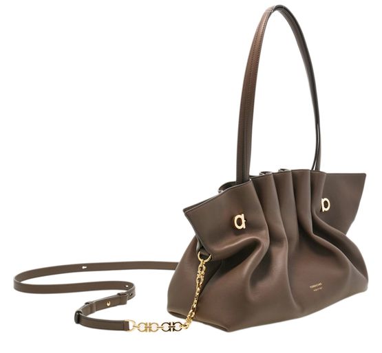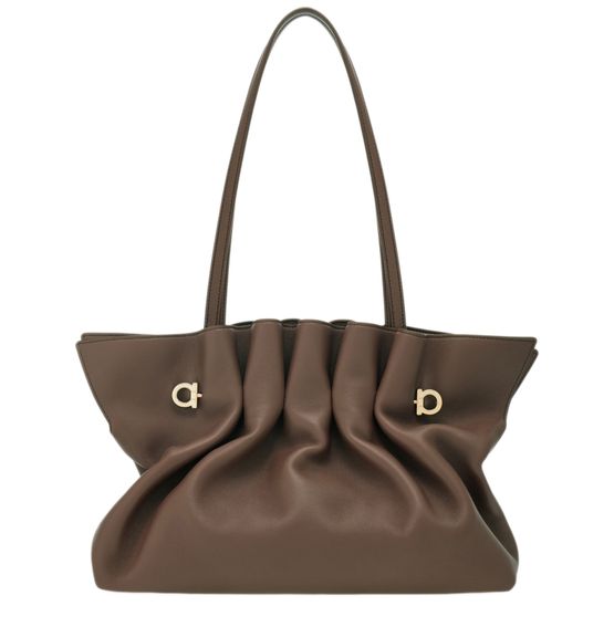 Reveal Salvatore Ferragamo's soft hand bag, crafted from smooth leather with double handles for versatile carrying. The front logo in gold letters and visible stitching highlight refined craftsmanship, while the gold finish adds a sophisticated touch to this modern shoulder bag.