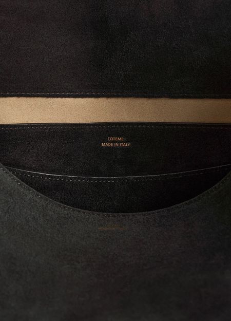 Reveal Toteme's T-Lock suede satchel, crafted from supple suede with a single handle for effortless carrying. The gold-finish logo clasp and metallic logo on the front add a refined touch, while the spacious interior compartment and interior pocket ensure both style and practicality.